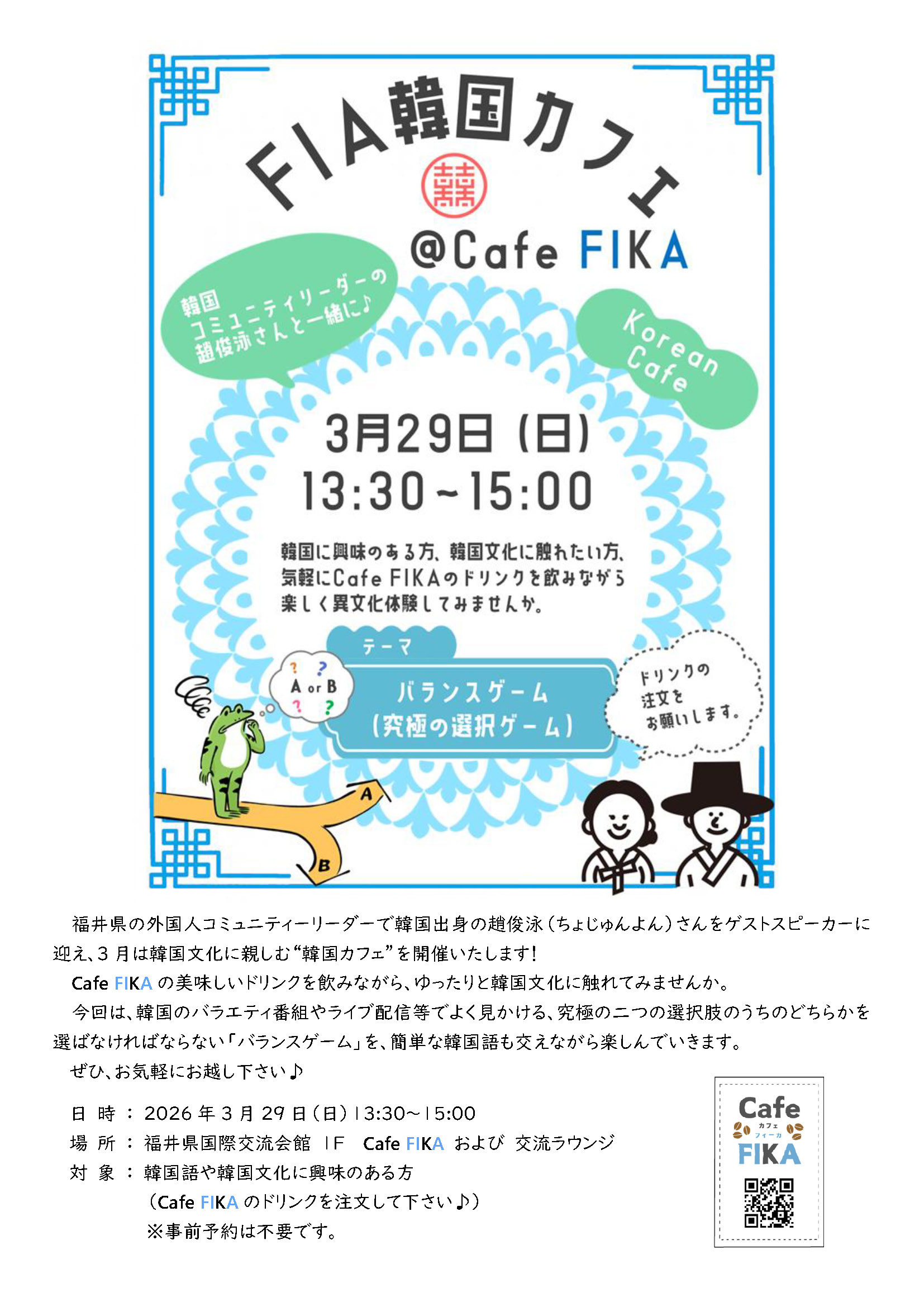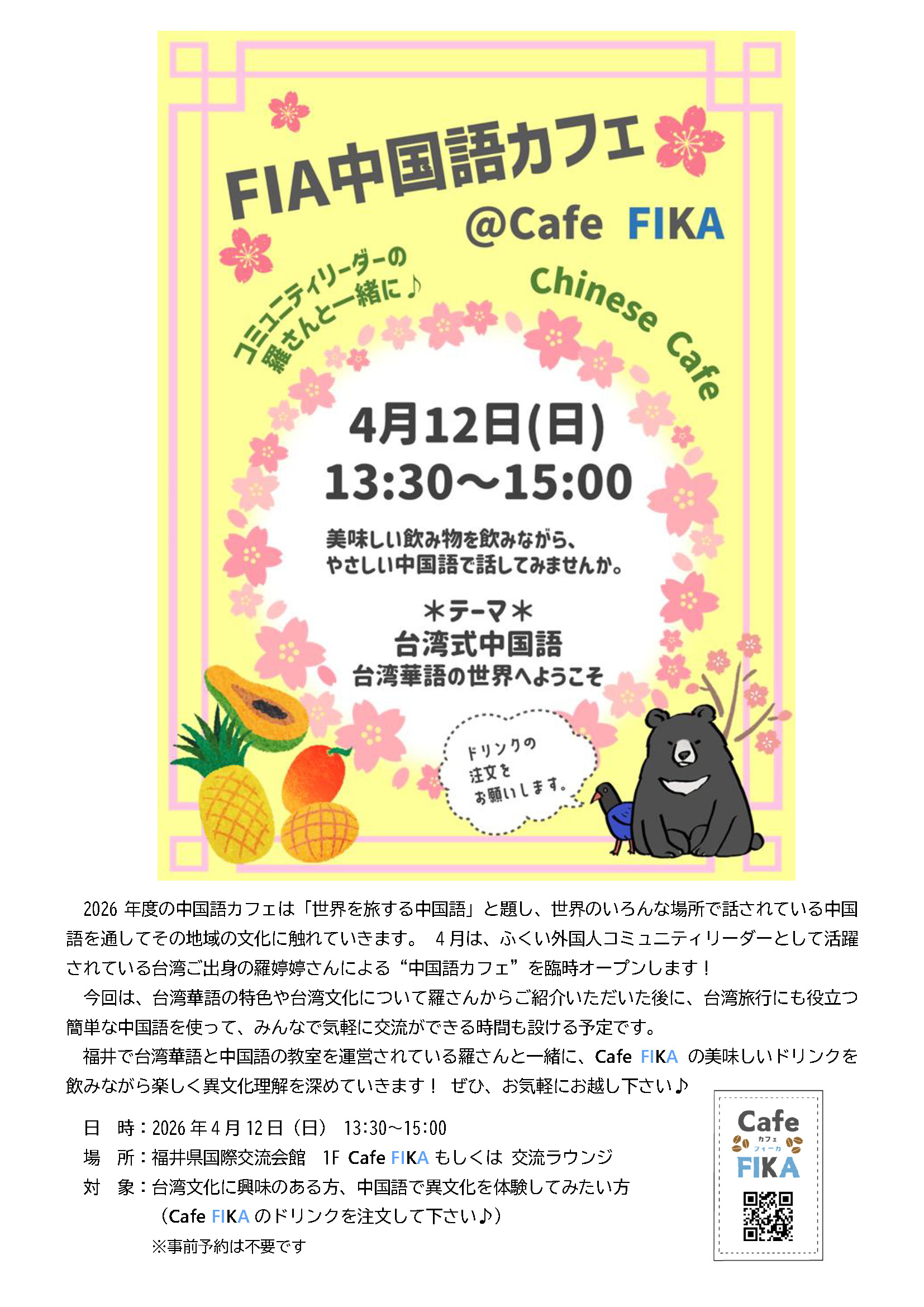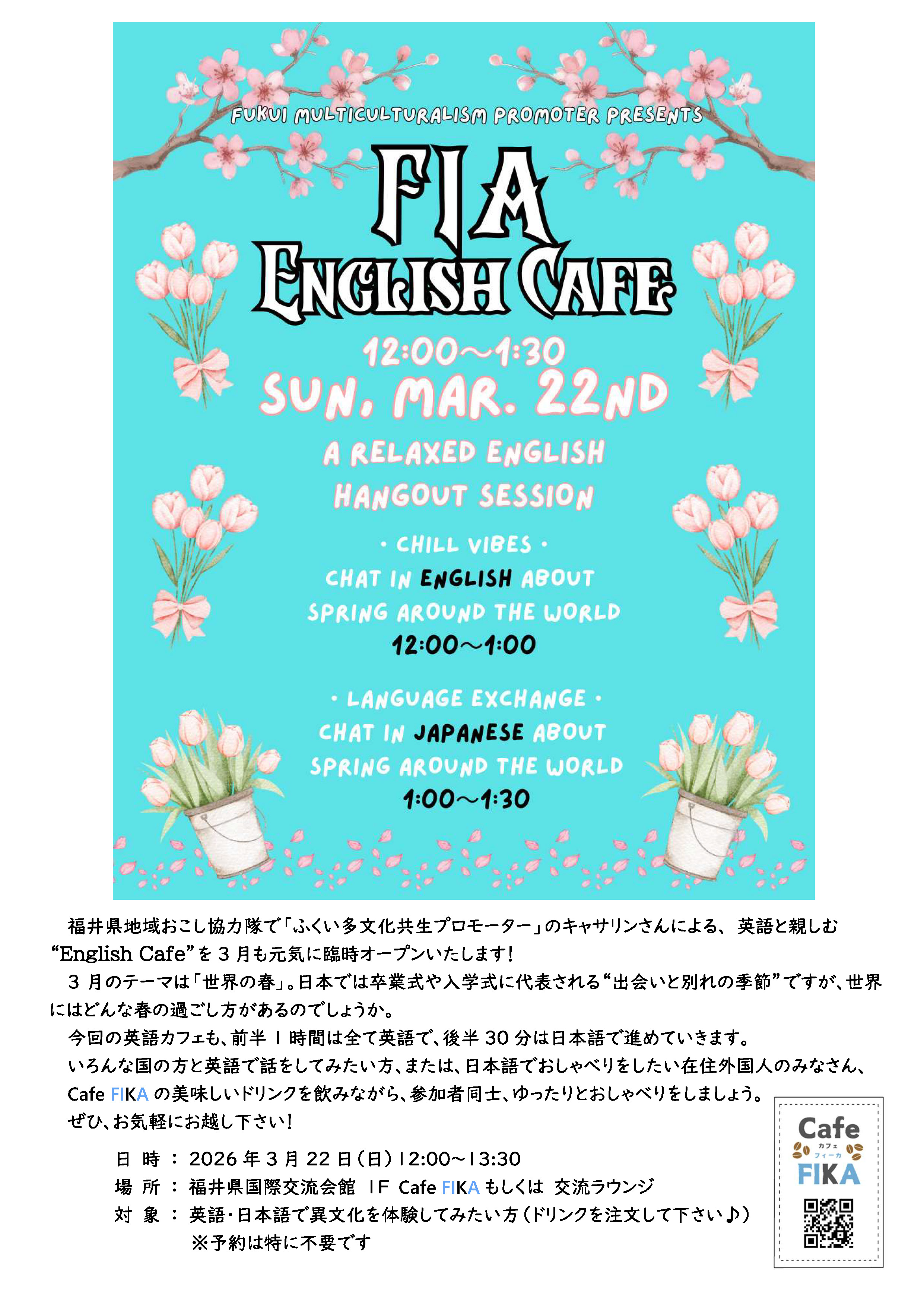 🌼開催のお知らせは、このホームページまたは福井県国際交流協会のInstagram・Facebookでお知らせします。(お楽しみに!!)